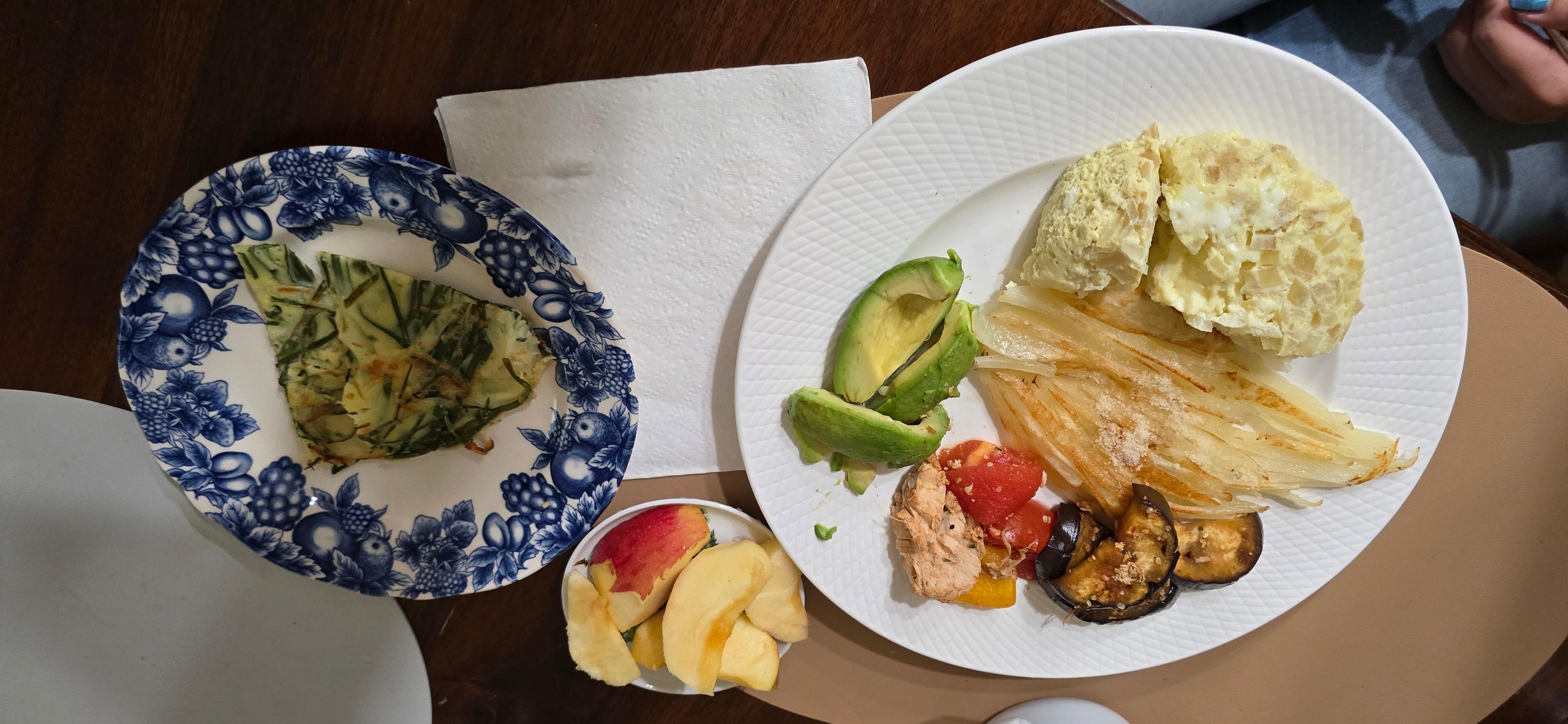 양파 다진 소금 없는 달걀찜, 아보카도 반쪽과