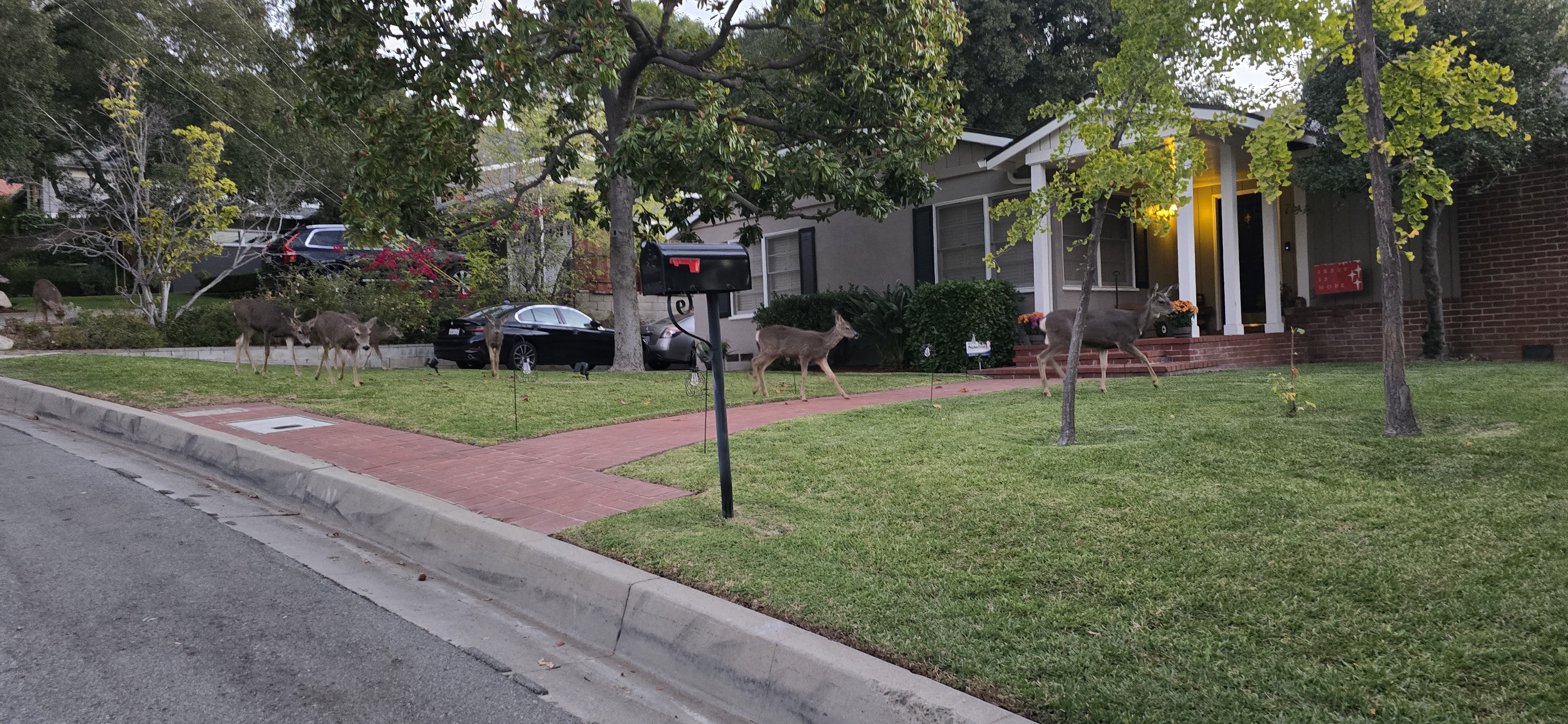 산과 인접한 동네에 사슴 가족이