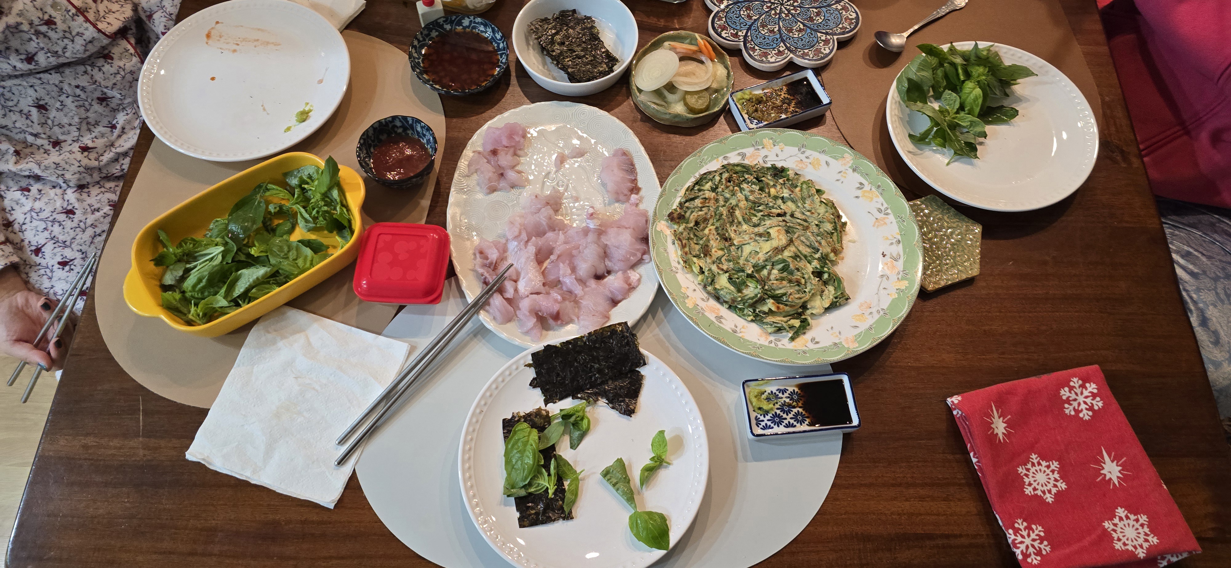 바질로 쌈을 싸 먹으며