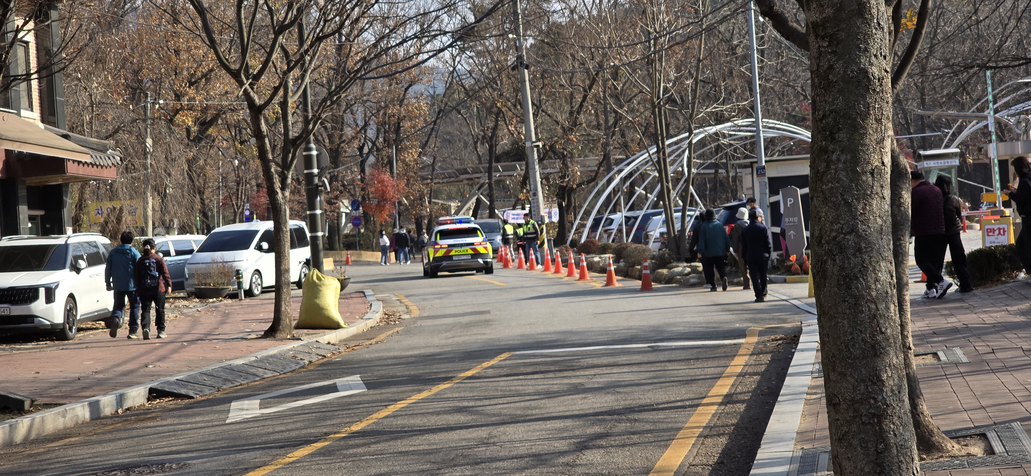 들어서자 순찰차와 길을 정비하는