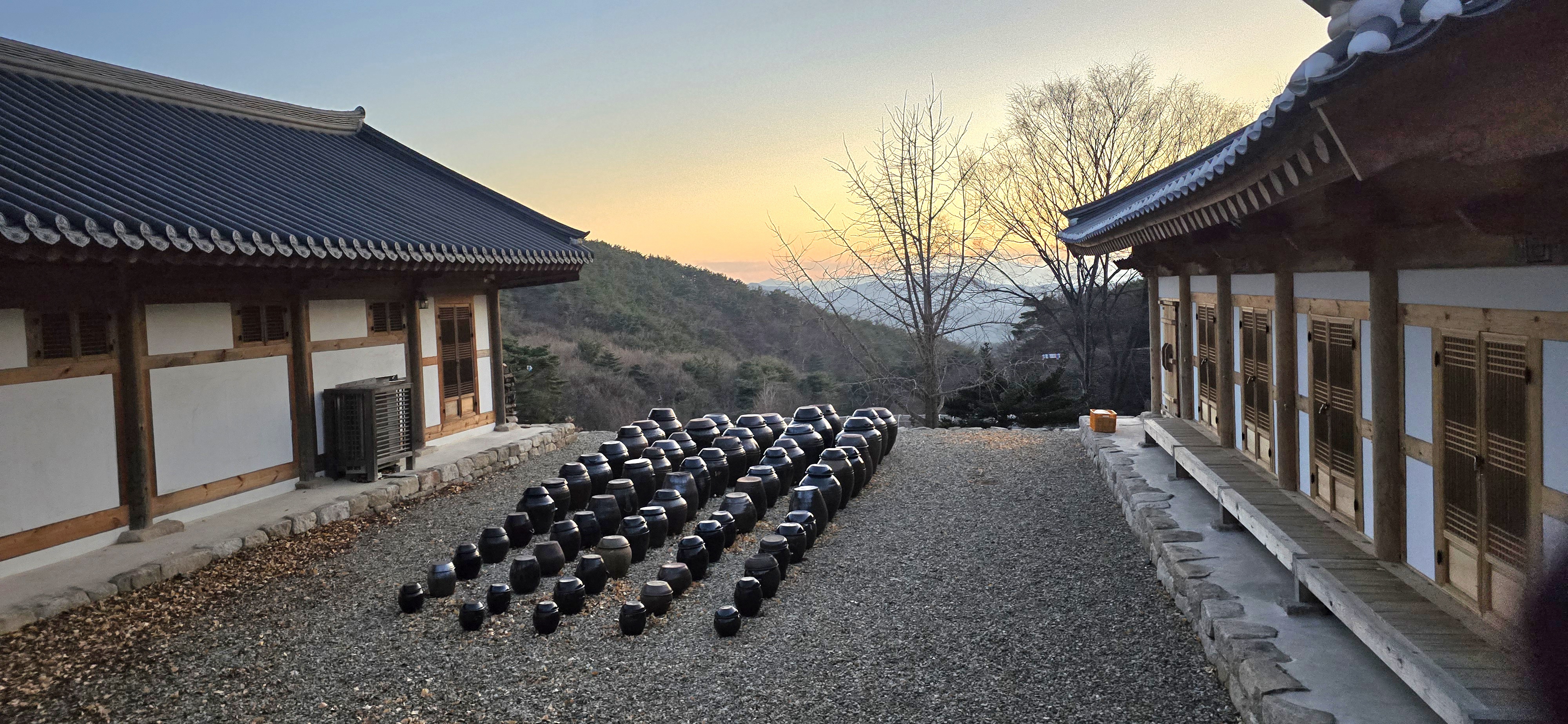 가지런히 줄지어 선 장독대도